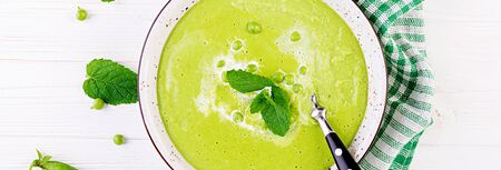 Green pea soup in bowl on wooden table. French cuisine. Banner. Top view