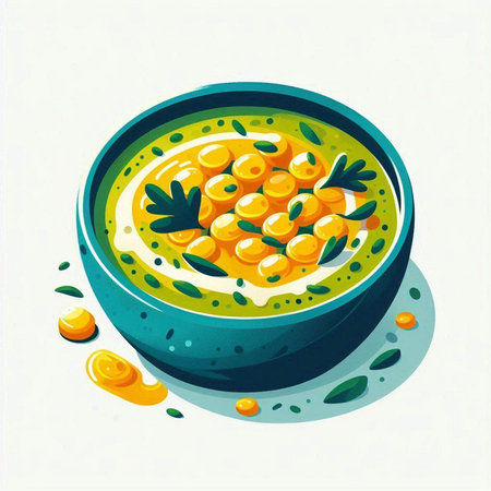 Vector illustration of vegetable soup with chickpeas, parsley and mustard