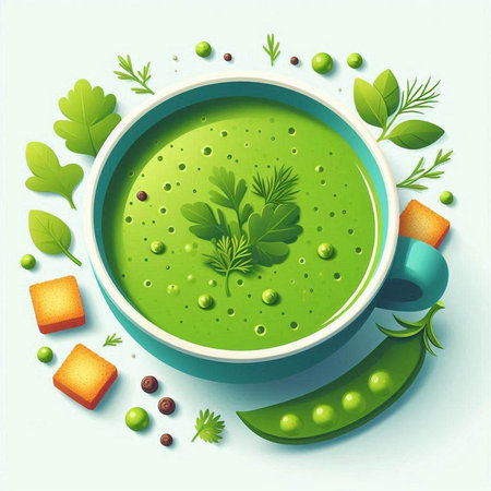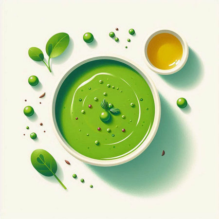 Vector illustration of fresh green pea soup in bowl with ingredients.