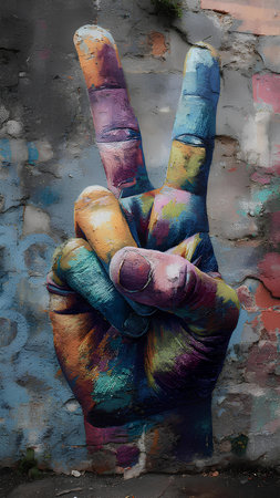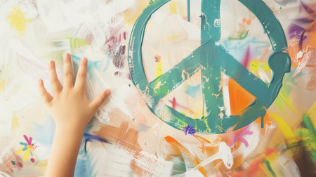 A child's hand is touching a peace sign on a wall. The peace sign is surrounded by a colorful mess of paint, which gives the image a playful and creative vibe. AI generated.