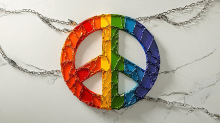 A vibrant peace symbol in rainbow colors suspended by a chain, against a textured marble backdrop, representing unity and harmony in a creative and modern design.