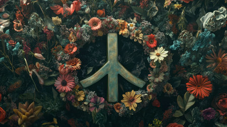 A vibrant floral arrangement featuring a peace symbol surrounded by an array of colorful flowers, showcasing beauty, harmony, and creativity in nature.