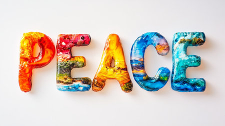 Vibrant PEACE Sign Buchstabencrafted from Serene Landscapes, Studio Shot on White Background