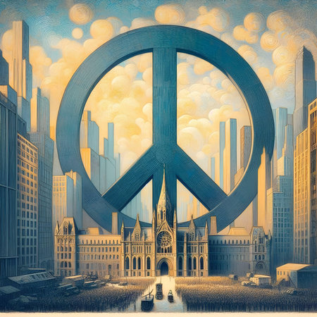 Peace sign with cityscape background, 3D illustration of peace symbol