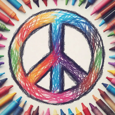 Childs crayon drawing of peace sign on paper, Ai generated image
