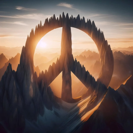 Peace symbol formed by mountain range at golden hour, Ai generated image
