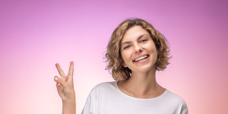 Young happy smiling woman showing victory sign.