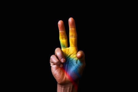 the hand of a man making the V sign with his fingers painted as the rainbow flag, against a blue background, with some blank space on top