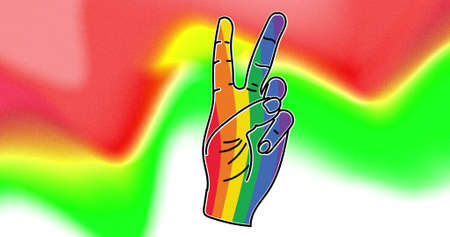 Image of rainbow victory symbol over colorful background. lgbt rights and equality concept digitally generated image.