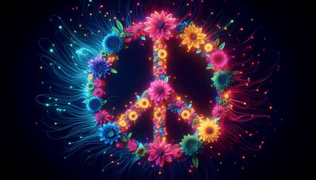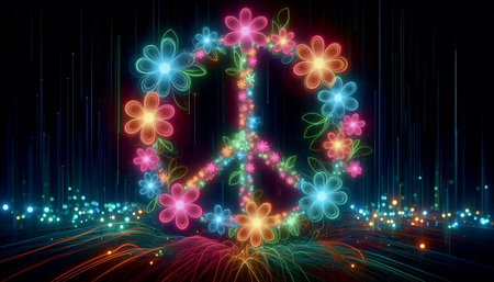 Glowing neon flowers forming peace symbol, Ai generated image