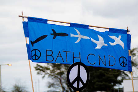 Aldermaston, United Kingdom, 1st April 2018:- CND protesters gather outside the main gate to the AWE where Britain’s nuclear warheads are made, on the 60th anniversary of the first CND march in 1958