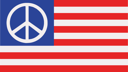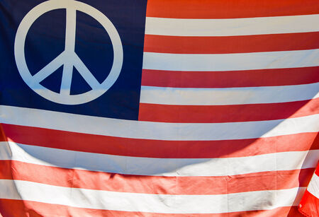 Sign of Peace flag on USA waving in the wind. American peaceful flags wavy. Symbol of pacifist united states blowing, soft and smooth silk. Realistic cloth fabric texture ensign background.