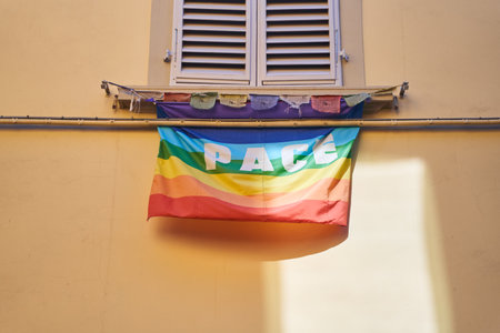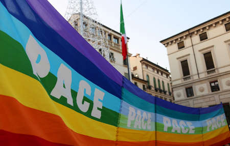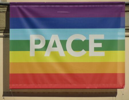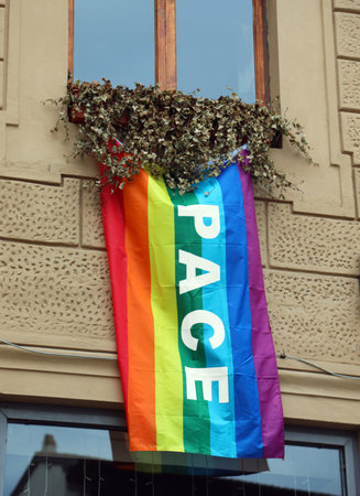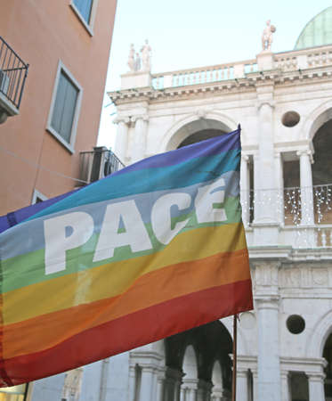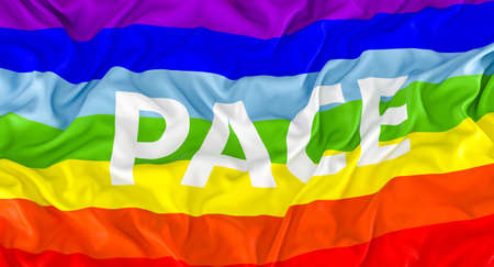 historic Italian monument and the multicolored flag with the word PACE which means Peace in Italian language