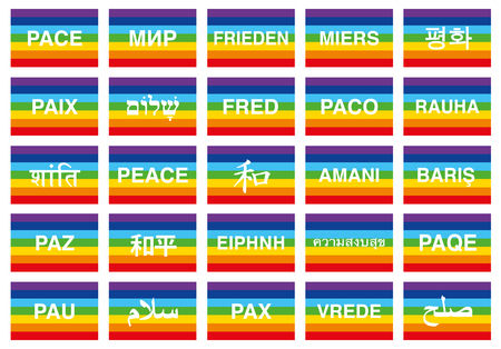 Concept of world peace and no war with white hippie peace sign on colorful rainbow flag