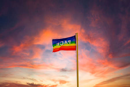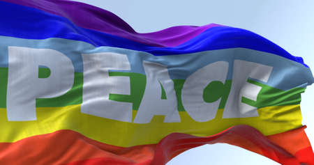 Sign of Peace flag waving in the wind. Rainbow colors of peaceful wavy. Symbol of pacifist blowing, soft and smooth silk. Cloth fabric texture ensign background.