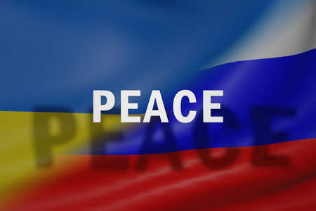 lettering peace in front of waving ukraine and russian flag, 3D rendering