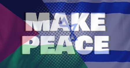 Image of stop war make peace text over flag of palestine and israel. Palestine israel conflict, finance, business and global politics concept digitally generated image.