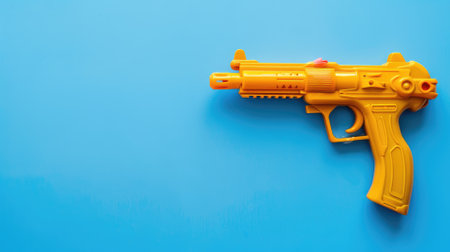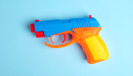 A vibrant toy pistol in blue, orange, and yellow is presented against a light blue backdrop.