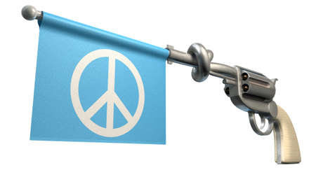 A six shooter gun with a knotted barrel with a blue flag coming out with a peace symbol on it on an isolated white background
