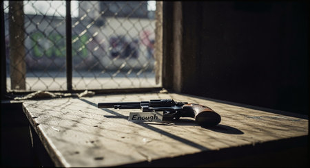 A close-up image of a hand gripping a revolver with a focus on the details of the gun, set against a grunge background. This image suggests themes of crime and potential violence