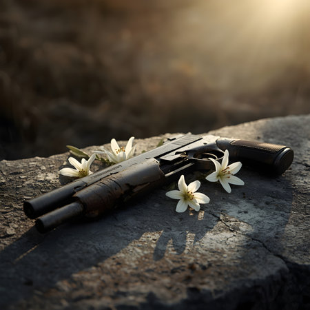 A gun laying on top of a bunch of yellow flowers. AI generative image.