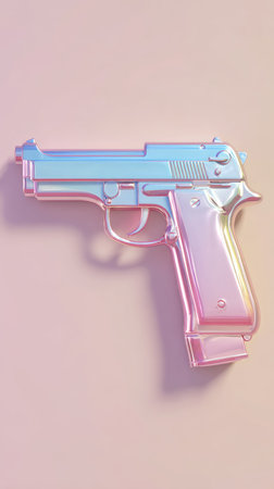 A shiny iridescent handgun is displayed on a pastel background. The gun is the main focus of the image.