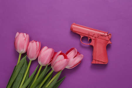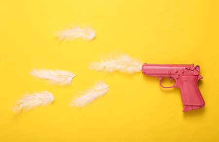 Pink pistol gun with feathers on yellow background. creative concept. Minimalist flat lay. Minimal layout.Top view