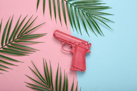 Pink gun and palm leaves on pink blue background. Tropical, minimal layout. top view. flat lay