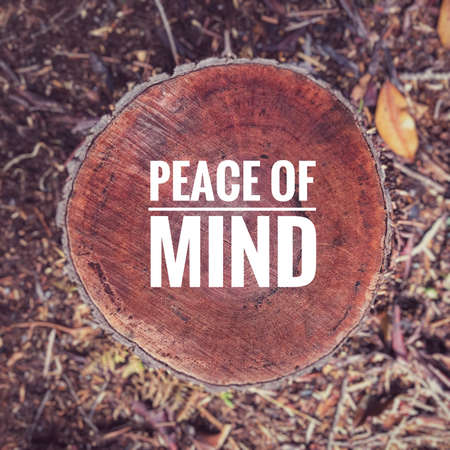 Motivational and inspirational quote -‘Peace of mind’ written on background of cut tree trunk. Blurred and vintage styled.
