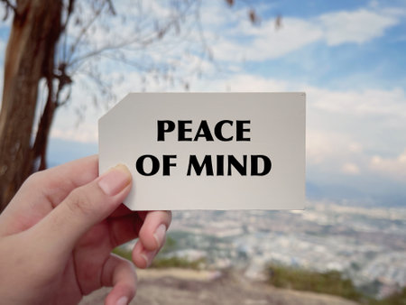 Motivational and inspirational quote ‘PEACE OF MIND’ written on black paper. Background of nature.