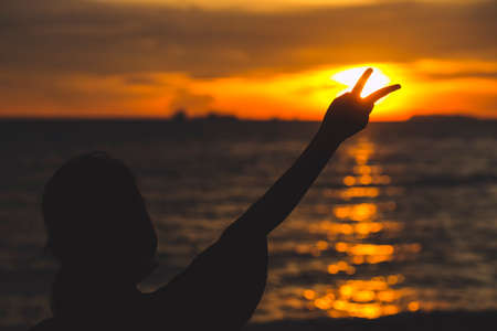 Female showing peace sign on nature bokeh blur sunset background. Copy space with the concept of happy love valentine's dream travel and freedom.