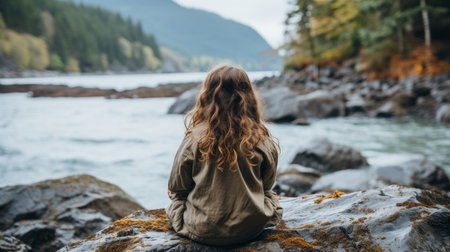 A person is sitting on a rock in front of a lake. peaceful and quiet concept.
