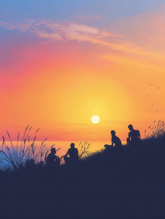 A scenic sunset over the ocean with silhouettes of four friends sitting on a hill, enjoying the peaceful evening together.