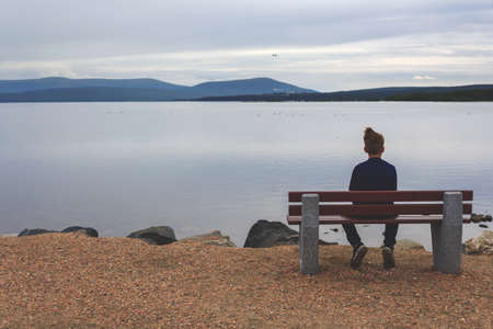 Teenager sitting alone on bench on lake in the evening, looking at horizon and thinking about future. Unity with nature. Loneliness of youth. Psychological assistance to young people.