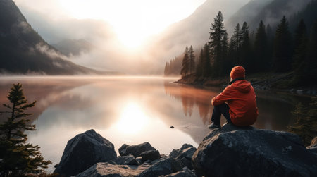 Generative AI Image of Back View of Man Sitting on Rock with Lake River Landscape at Sunset Sunrise