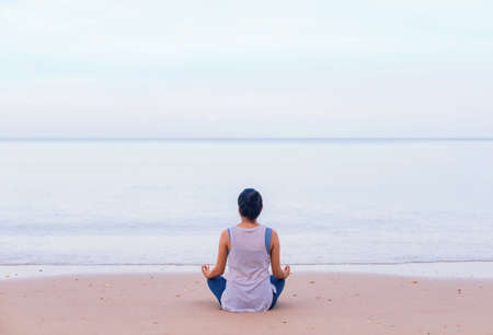Asian woman warm up and play yoga exercise and meditating on the beach by the sea at morning sky background.