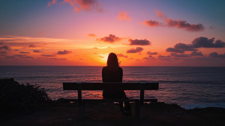 Wide angle shot of the Silhouette of a woman sitting on a bench looking at the tranquil sunset over the ocean