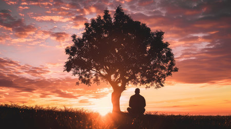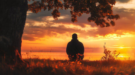 A young man sits peacefully in a sunlit meadow, eyes closed, as he enjoys a calm and meditative moment outdoors. The golden light of the setting sun creates a serene atmosphere, highlighting his relaxed posture and connection to nature. Generated by AI