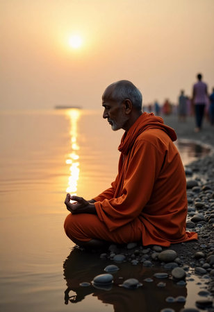A serene monk sits at the water's edge of the Ganges in Varanasi, deep in meditation as the sun sets, casting golden reflections over the calm waters.
