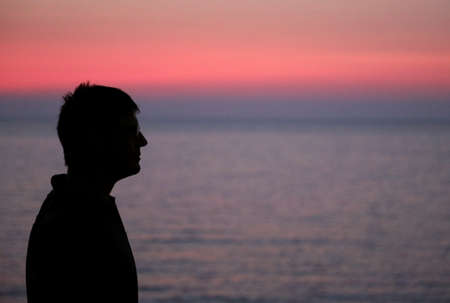 A silhouette of a boy standing at the edge of a lake at sunset, feeling small and alone in the vast landscape