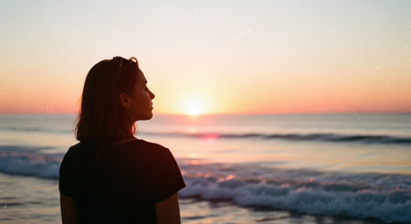 A young woman stands on the beach eyes closed savoring the peaceful ocean air at sunset.