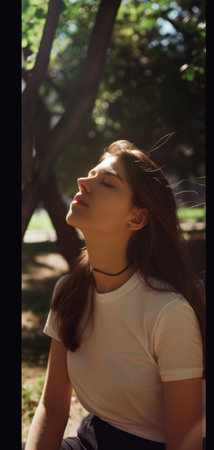 A beautiful young woman sits on a park bench with her eyes closed, smiling as she enjoys the warm spring sunshine. Green trees and a pond with blooming flowers create a tranquil background for this moment of leisure and mental wellness.