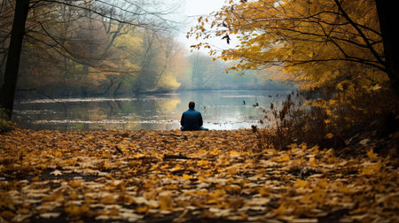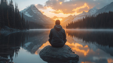 A man sits on a rock by a lake, looking out at the water. The scene is peaceful and serene, with the man's reflection in the water adding to the sense of calm. Concept of solitude and contemplation