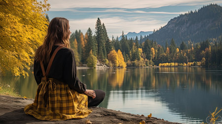 Woman meditating on the lake in the autumn forest at sunset. generative ai