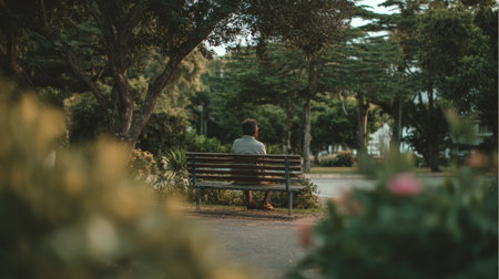 A serene moment captured in a park, showcasing a person sitting on a bench amidst lush greenery and vibrant flowers, evoking feelings of tranquility and solitude.