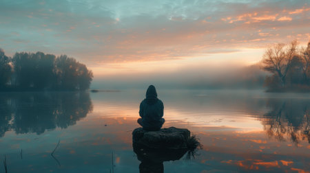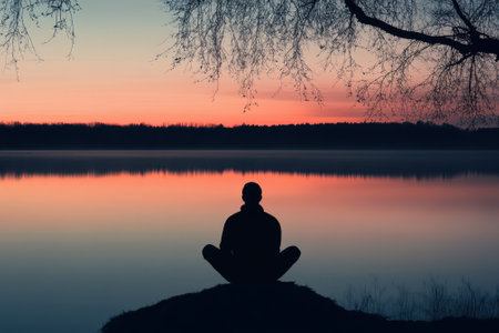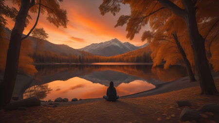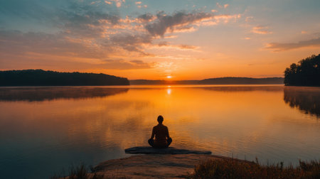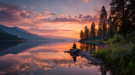 A person sits peacefully by a lake, meditating as the sun sets, casting vibrant colors across the water.