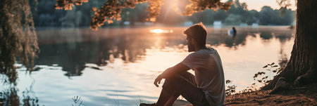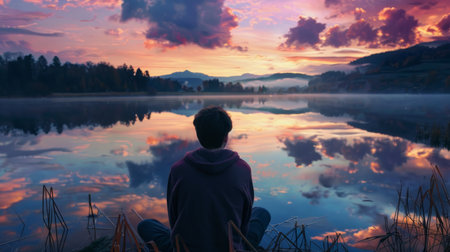 Serene Sunset Reflection Man Relaxing by Lakeside in Tranquil Nature Setting.