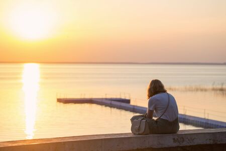 A young woman sits alone by the sea and looks at the sunset. View from the back. The concept of psychology and mental health.