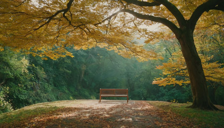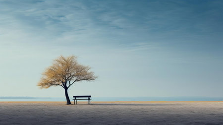 a tree and bench stand by the ocean, surrounded by a light sky-blue and dark gold color palette. this ethereal minimalistic scene, captured in 8k resolution, showcases desolate landscapes and embodies the prairiecore aesthetic. the cold and detached atmosphere creates a unique blend of metropolis meeting nature. ai generated