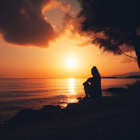Silhouetted figure sitting in a contemplative pose on rocky coastal cliffs surrounded by a breathtaking sunset over the ocean This serene and peaceful scene evokes a sense of solitude tranquility
